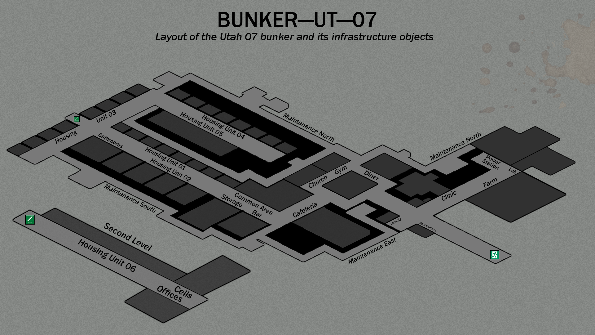 Built late into the Collapse under the Civil Defense Initiative, the bunker is one of several attempts to sustain a human population underground, sealing away a hundred or so chosen souls away from the chaos above.